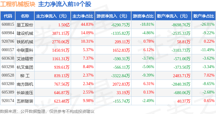 从资金流向上来看,当日工程机械板块主力资金净流出1.74亿元,游资资金净流入2224.39万元,散户资金净流入1.52亿元。工程机械板块个股资金流向见下表: