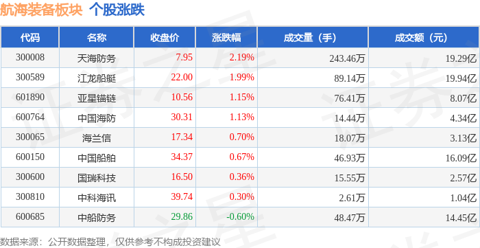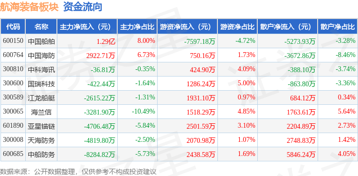 从资金流向上来看,当日航海装备板块主力资金净流出8373.65万元,游资资金净流入5324.67万元,散户资金净流入3048.98万元。航海装备板块个股资金流向见下表: