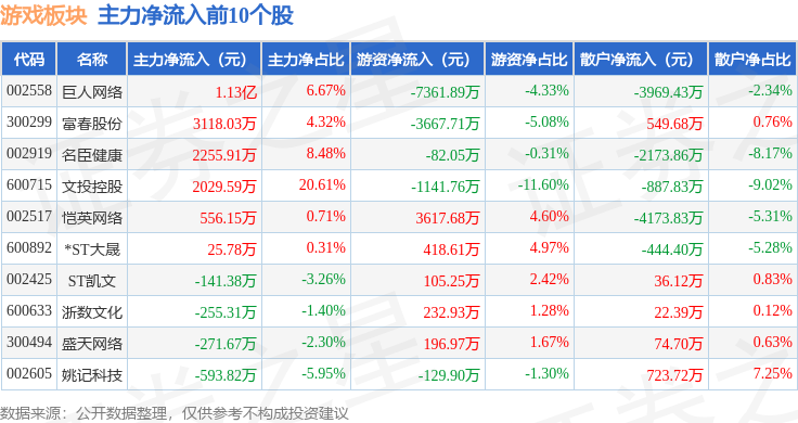 从资金流向上来看,当日游戏板块主力资金净流出4.01亿元,游资资金净流入1392.79万元,散户资金净流入3.88亿元。游戏板块个股资金流向见下表: