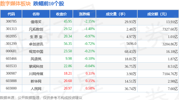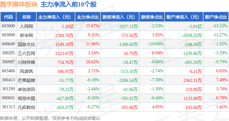 从资金流向上来看,当日数字媒体板块主力资金净流入3347.05万元,游资资金净流出2214.52万元,散户资金净流出1132.53万元。数字媒体板块个股资金流向见下表: