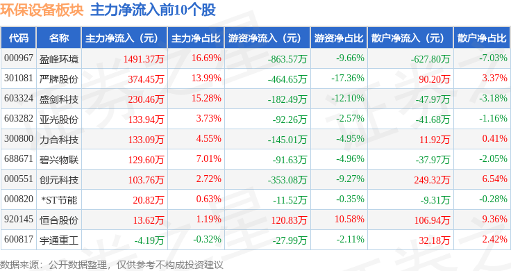 从资金流向上来看,当日环保设备板块主力资金净流出9602.52万元,游资资金净流入648.16万元,散户资金净流入8954.35万元。环保设备板块个股资金流向见下表: