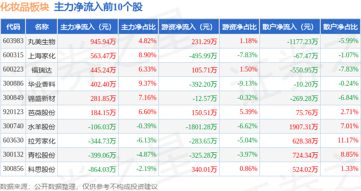 从资金流向上来看,当日化妆品板块主力资金净流出6103.78万元,游资资金净流出1560.17万元,散户资金净流入7663.95万元。化妆品板块个股资金流向见下表: