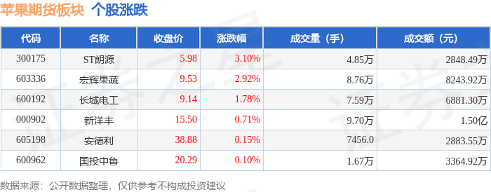 证券之星消息,11月28日苹果期货板块较上一交易日上涨1.02%,ST朗源领涨。当日上证指数报收于3888.6,上涨0.34%。深证成指报收于12984.08,上涨0.85%。苹果期货板块个股涨跌见下表: