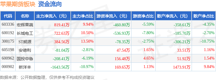 从资金流向上来看,当日苹果期货板块主力资金净流出6.4万元,游资资金净流出702.42万元,散户资金净流入708.82万元。苹果期货板块个股资金流向见下表: