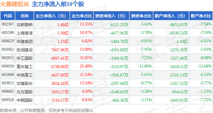 从资金流向上来看,当日大基建板块主力资金净流入3.99亿元,游资资金净流出2.99亿元,散户资金净流出9967.88万元。大基建板块个股资金流向见下表: