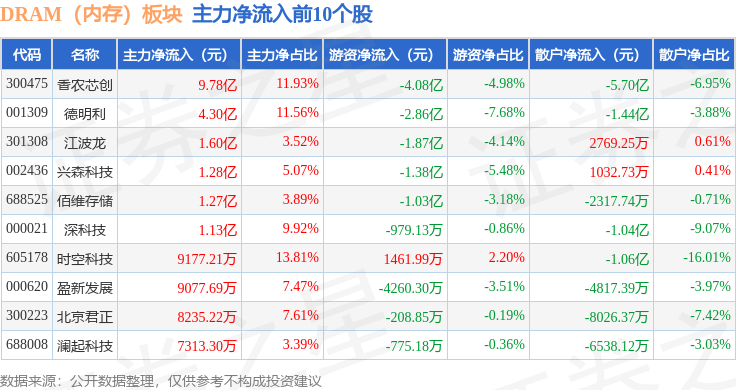 从资金流向上来看,当日DRAM(内存)板块主力资金净流入21.81亿元,游资资金净流出12.54亿元,散户资金净流出9.27亿元。DRAM(内存)板块个股资金流向见下表: