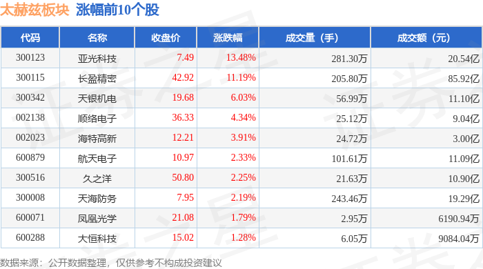 证券之星消息,11月28日太赫兹板块较上一交易日上涨3.29%,亚光科技领涨。当日上证指数报收于3888.6,上涨0.34%。深证成指报收于12984.08,上涨0.85%。太赫兹板块个股涨跌见下表: