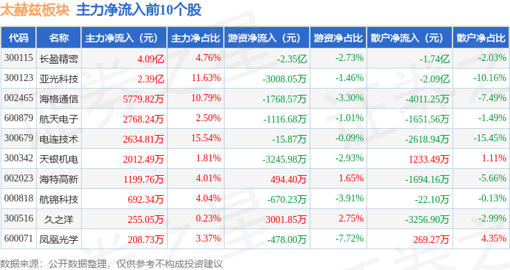 从资金流向上来看,当日太赫兹板块主力资金净流入6.66亿元,游资资金净流出2.57亿元,散户资金净流出4.09亿元。太赫兹板块个股资金流向见下表: