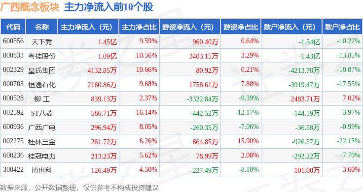 从资金流向上来看,当日广西概念板块主力资金净流入2.18亿元,游资资金净流入1641.69万元,散户资金净流出2.35亿元。广西概念板块个股资金流向见下表: