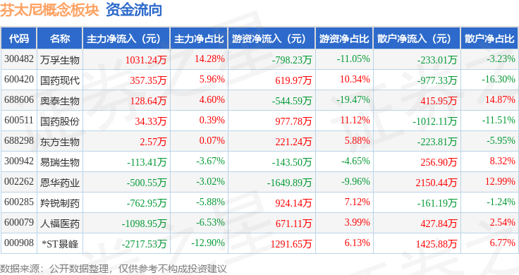 从资金流向上来看,当日芬太尼概念板块主力资金净流出3639.25万元,游资资金净流入1569.7万元,散户资金净流入2069.55万元。芬太尼概念板块个股资金流向见下表: