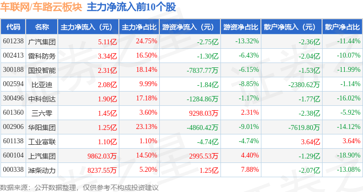 从资金流向上来看,当日车联网/车路云板块主力资金净流入12.21亿元,游资资金净流出9.78亿元,散户资金净流出2.42亿元。车联网/车路云板块个股资金流向见下表: