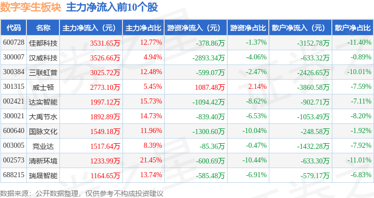 从资金流向上来看,当日数字孪生板块主力资金净流出4.98亿元,游资资金净流出1.15亿元,散户资金净流入6.13亿元。数字孪生板块个股资金流向见下表: