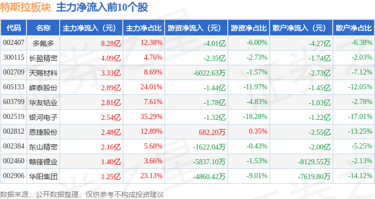 从资金流向上来看,当日特斯拉板块主力资金净流入32.67亿元,游资资金净流出18.27亿元,散户资金净流出14.4亿元。特斯拉板块个股资金流向见下表: