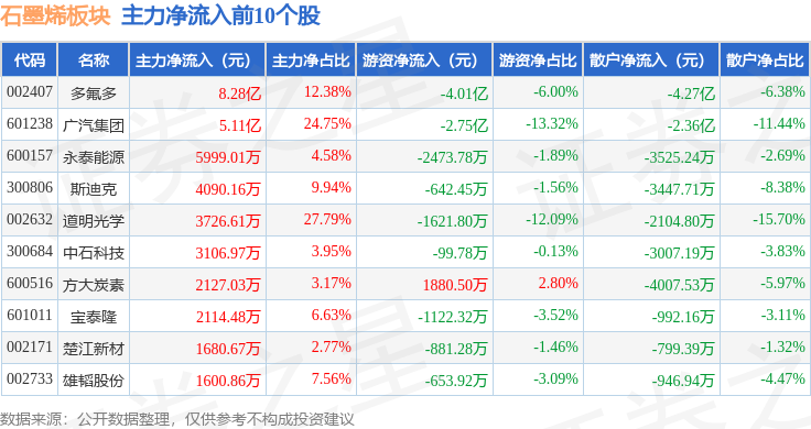 从资金流向上来看,当日石墨烯板块主力资金净流入11.66亿元,游资资金净流出9.62亿元,散户资金净流出2.04亿元。石墨烯板块个股资金流向见下表: