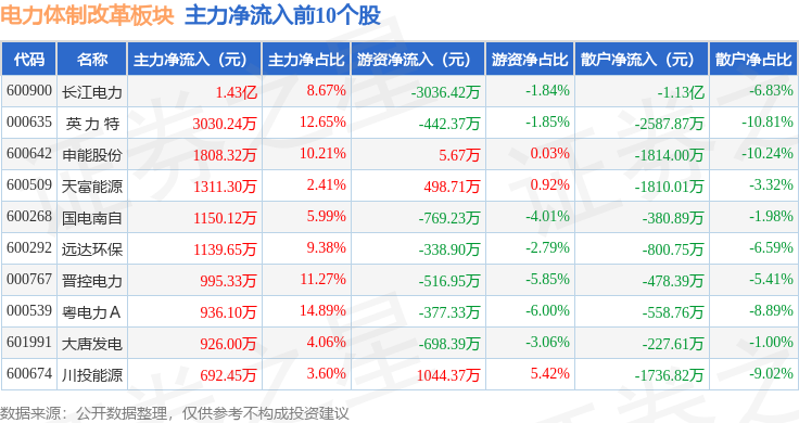 从资金流向上来看,当日电力体制改革板块主力资金净流出1.2亿元,游资资金净流入2.12亿元,散户资金净流出9201.06万元。电力体制改革板块个股资金流向见下表: