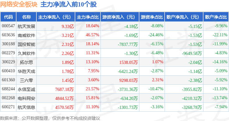 从资金流向上来看,当日网络安全板块主力资金净流入6.75亿元,游资资金净流出9.39亿元,散户资金净流入2.63亿元。网络安全板块个股资金流向见下表: