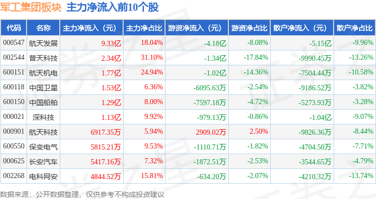 从资金流向上来看,当日军工集团板块主力资金净流入10.43亿元,游资资金净流出9.18亿元,散户资金净流出1.25亿元。军工集团板块个股资金流向见下表: