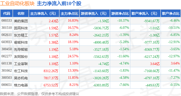 从资金流向上来看,当日工业自动化板块主力资金净流入6.92亿元,游资资金净流出12.73亿元,散户资金净流入5.81亿元。工业自动化板块个股资金流向见下表: