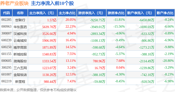 从资金流向上来看,当日养老产业板块主力资金净流出3.26亿元,游资资金净流出2162.5万元,散户资金净流入3.48亿元。养老产业板块个股资金流向见下表: