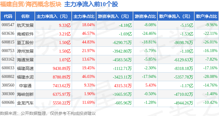 从资金流向上来看,当日福建自贸/海西概念板块主力资金净流入9.62亿元,游资资金净流出4.6亿元,散户资金净流出5.03亿元。福建自贸/海西概念板块个股资金流向见下表:
