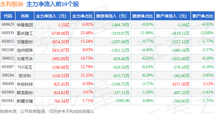 从资金流向上来看,当日水利板块主力资金净流出9641.57万元,游资资金净流出2.91亿元,散户资金净流入3.87亿元。水利板块个股资金流向见下表: