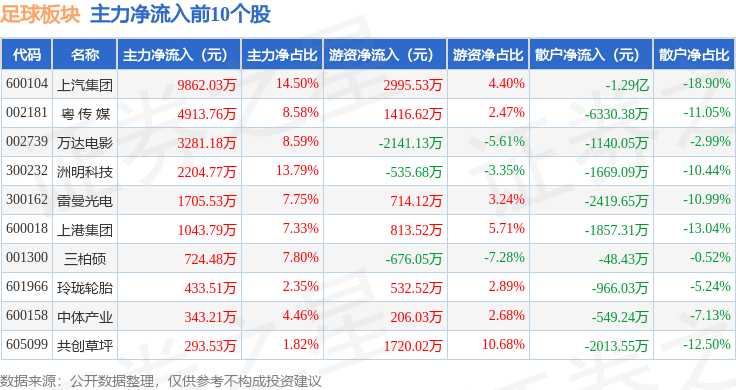 从资金流向上来看,当日足球板块主力资金净流入8375.92万元,游资资金净流入7527.22万元,散户资金净流出1.59亿元。足球板块个股资金流向见下表: