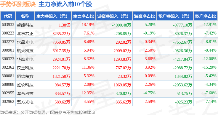 从资金流向上来看,当日手势识别板块主力资金净流入2.82亿元,游资资金净流入3270.69万元,散户资金净流出3.15亿元。手势识别板块个股资金流向见下表: