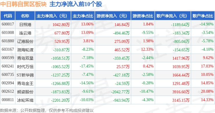 从资金流向上来看,当日中日韩自贸区板块主力资金净流出1.77亿元,游资资金净流出5766.72万元,散户资金净流入2.35亿元。中日韩自贸区板块个股资金流向见下表: