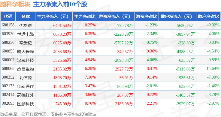 从资金流向上来看,当日脑科学板块主力资金净流出6.89亿元,游资资金净流入3356.06万元,散户资金净流入6.55亿元。脑科学板块个股资金流向见下表: