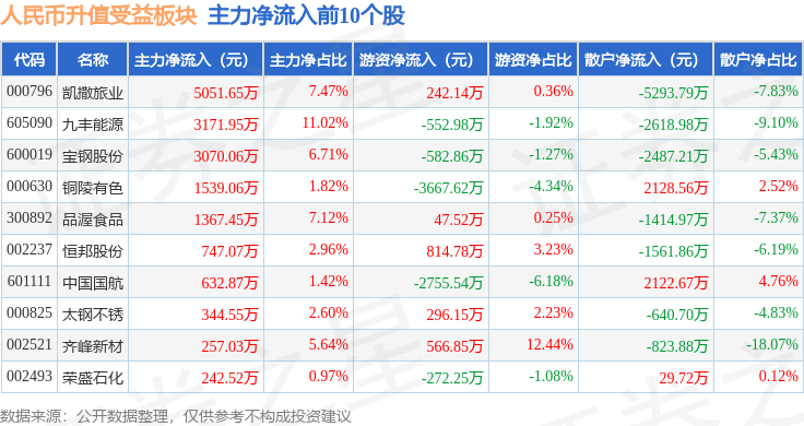 从资金流向上来看,当日人民币升值受益板块主力资金净流出1.64亿元,游资资金净流入2585.95万元,散户资金净流入1.38亿元。人民币升值受益板块个股资金流向见下表: