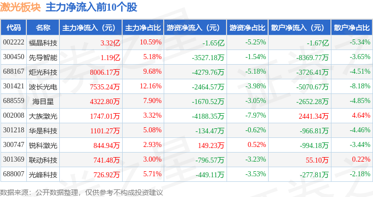从资金流向上来看,当日激光板块主力资金净流入1316.31万元,游资资金净流出3.49亿元,散户资金净流入3.36亿元。激光板块个股资金流向见下表: