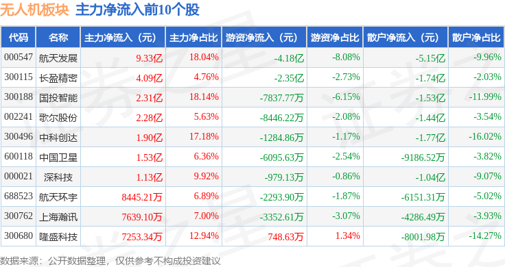 从资金流向上来看,当日无人机板块主力资金净流入15.51亿元,游资资金净流出9.18亿元,散户资金净流出6.33亿元。无人机板块个股资金流向见下表: