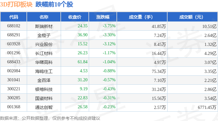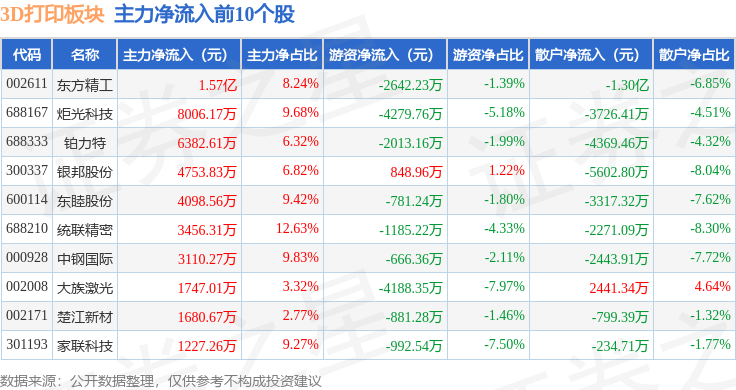 从资金流向上来看,当日3D打印板块主力资金净流入1.97亿元,游资资金净流出2.11亿元,散户资金净流入1418.84万元。3D打印板块个股资金流向见下表: