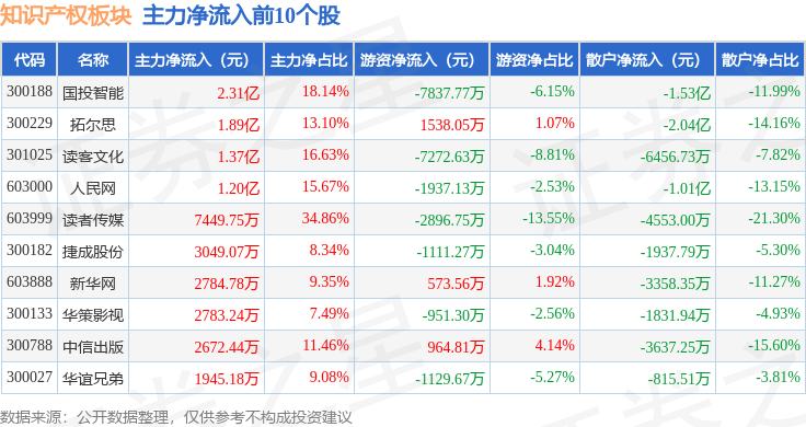 从资金流向上来看,当日知识产权板块主力资金净流入4.74亿元,游资资金净流出1.06亿元,散户资金净流出3.68亿元。知识产权板块个股资金流向见下表: