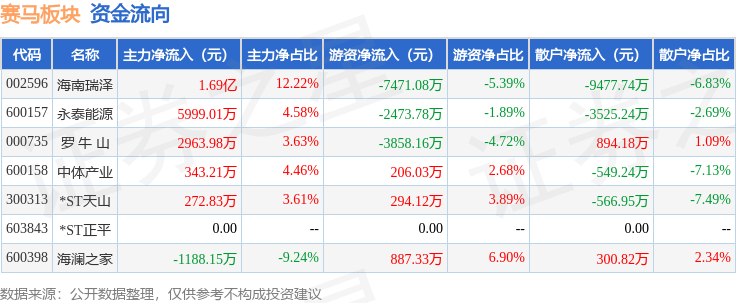 从资金流向上来看,当日赛马板块主力资金净流入2.53亿元,游资资金净流出1.24亿元,散户资金净流出1.29亿元。赛马板块个股资金流向见下表: