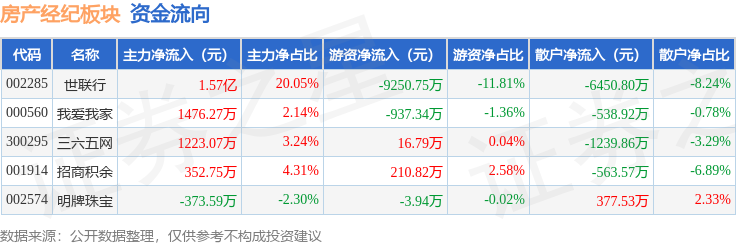 从资金流向上来看,当日房产经纪板块主力资金净流入1.84亿元,游资资金净流出9964.42万元,散户资金净流出8415.62万元。房产经纪板块个股资金流向见下表: