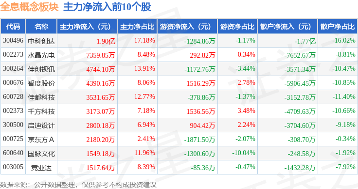 从资金流向上来看,当日全息概念板块主力资金净流出9121.35万元,游资资金净流入7007.14万元,散户资金净流入2114.21万元。全息概念板块个股资金流向见下表: