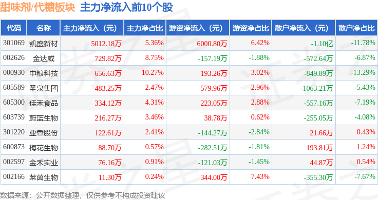 从资金流向上来看,当日甜味剂/代糖板块主力资金净流出367.73万元,游资资金净流入1.17亿元,散户资金净流出1.13亿元。甜味剂/代糖板块个股资金流向见下表: