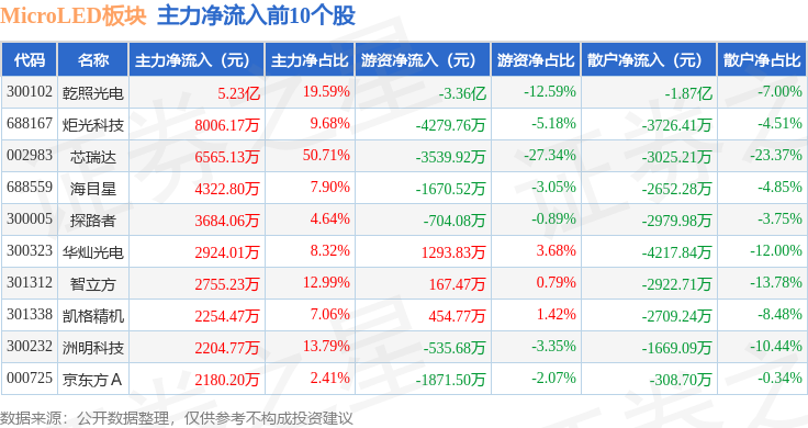 从资金流向上来看,当日MicroLED板块主力资金净流入3.34亿元,游资资金净流出2.11亿元,散户资金净流出1.23亿元。MicroLED板块个股资金流向见下表: