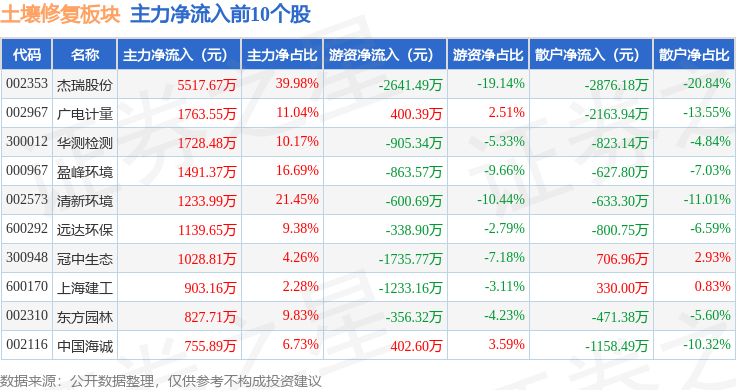 从资金流向上来看,当日土壤修复板块主力资金净流出2.27亿元,游资资金净流出1.05亿元,散户资金净流入3.32亿元。土壤修复板块个股资金流向见下表: