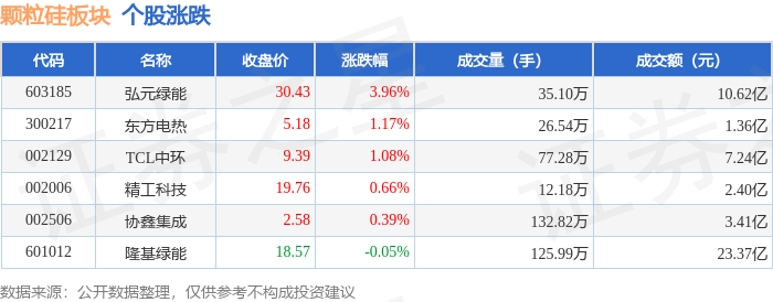 证券之星消息,11月28日颗粒硅板块较上一交易日上涨0.57%,弘元绿能领涨。当日上证指数报收于3888.6,上涨0.34%。深证成指报收于12984.08,上涨0.85%。颗粒硅板块个股涨跌见下表: