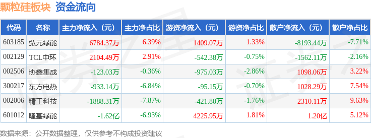 从资金流向上来看,当日颗粒硅板块主力资金净流出1.02亿元,游资资金净流入3600.65万元,散户资金净流入6640.0万元。颗粒硅板块个股资金流向见下表: