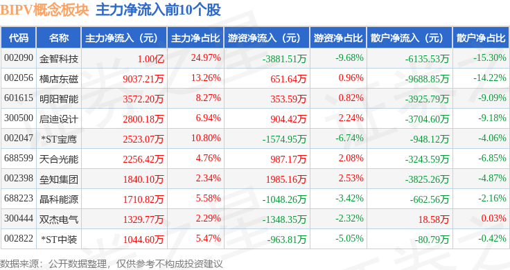 从资金流向上来看,当日BIPV概念板块主力资金净流入2943.08万元,游资资金净流出7466.24万元,散户资金净流入4523.16万元。BIPV概念板块个股资金流向见下表:
