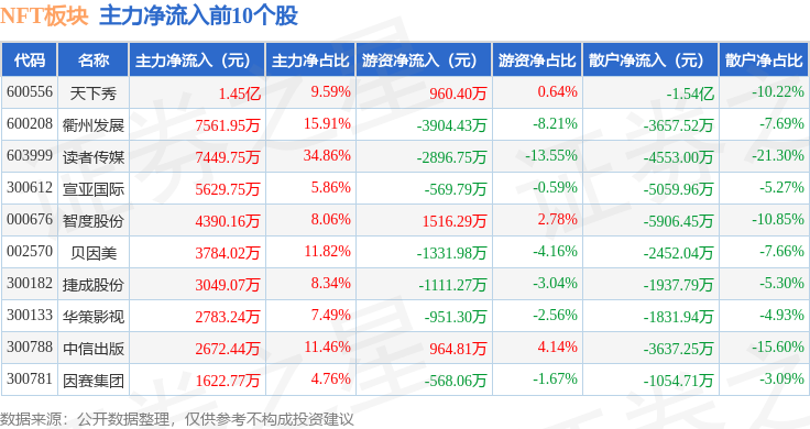 从资金流向上来看,当日NFT板块主力资金净流出5.97亿元,游资资金净流入3707.71万元,散户资金净流入5.6亿元。NFT板块个股资金流向见下表: