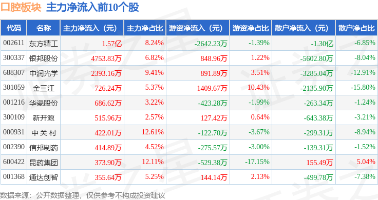 从资金流向上来看,当日口腔板块主力资金净流入5842.9万元,游资资金净流入3068.31万元,散户资金净流出8911.21万元。口腔板块个股资金流向见下表:
