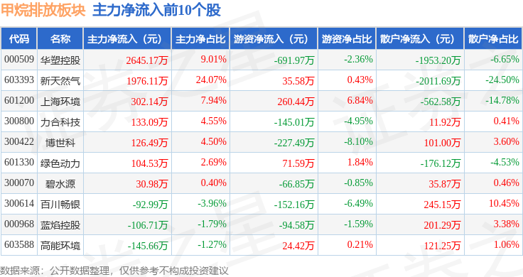 从资金流向上来看,当日甲烷排放板块主力资金净流出1585.23万元,游资资金净流入2540.83万元,散户资金净流出955.61万元。甲烷排放板块个股资金流向见下表: