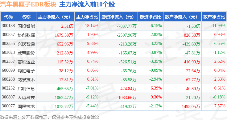 从资金流向上来看,当日汽车黑匣子EDR板块主力资金净流入1.24亿元,游资资金净流出1.12亿元,散户资金净流出1128.04万元。汽车黑匣子EDR板块个股资金流向见下表: