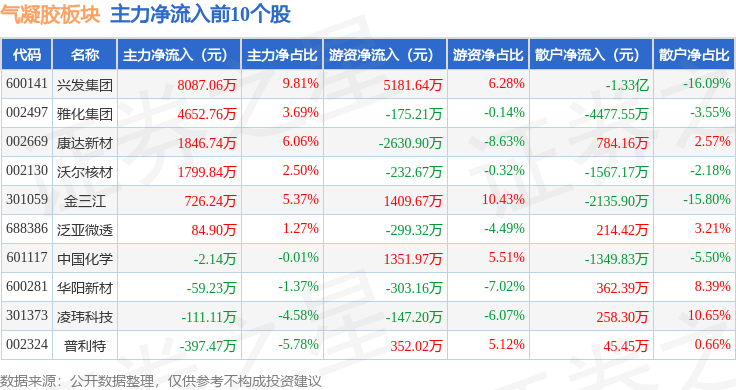 从资金流向上来看,当日气凝胶板块主力资金净流出1.51亿元,游资资金净流入4197.26万元,散户资金净流入1.09亿元。气凝胶板块个股资金流向见下表: