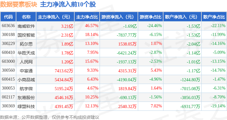 从资金流向上来看,当日数据要素板块主力资金净流入8.39亿元,游资资金净流入8249.7万元,散户资金净流出9.21亿元。数据要素板块个股资金流向见下表: