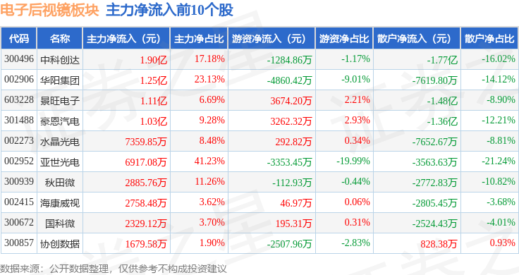 从资金流向上来看,当日电子后视镜板块主力资金净流出3.53亿元,游资资金净流入8.41亿元,散户资金净流出4.88亿元。电子后视镜板块个股资金流向见下表: